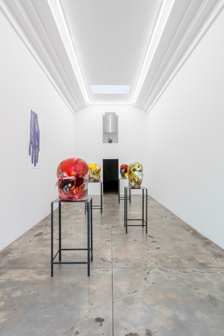 Dupont’s “Heads” sculptures are created from a singular blown-up cast of his head. An ongoing series that began in 2010, each cast is filled with various objects—some with the detritus of his studio practice, other works filled with objects that the artist encounters in his life or that simply catch his attention—sealed in place with a UV stable polyurethane resin, ensuring the preservation of their contents. In Placebo Head, 2021 a figurine, a spring clamp, a packet of ginseng, a toy strawberry, and as if winking to the viewer, a copy of The Meaning of History by Erich Kahler are visible amongst other items in a red color scheme. These objects exist in a paradoxical space between methodical choice and random encounter. On one level they function aesthetically in their coloration, but their size and ability to take up space in the cast of the head is also a consideration. Beyond that their seeming randomness reminds the viewer of the human need to understand the world around them, and to create meaning. A questioning of the concept of free will also exists. Can we operate according to our own thoughts, or are we held captive by external forces beyond our ability to control? Are we able to take the red pill, or is the red pill another illusion in the code of the Matrix?