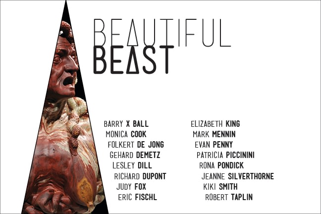 In her new work created for "Beautiful Beast," Monica Cook fabricates distorted figures out of disposable, but still haunting materials while Mark Mennin debuts a human-chicken hybrid out of flesh-colored Portuguese marble. This paradox using finely crafted materials and debased materials to address horrific imagery is further echoed throughout the exhibition. Ball X Ball’s work uses Mexican onyx to create corroded images of Renaissance masterpieces. Gehard Demetz’s finely crafted wooden sculptures present isolated figures whose desperation is implied through the use of empty drawers. Leslie Dill creates a storm of tin imagery spewing from the back of a seated figure. Richard Dupont’s digitally rendered self-portrait appears flayed when suspended from the wall, echoing Michelangelo’s The Last Judgment. Judy Fox creates ethereal figures surrounded by writhing, almost human worms. Eric Fischl revisits a moment of cultural horror to make a balletic elegy to lives lost. Folkert de Jong uses discarded materials to create comical analogs to the history of monumental sculpture, Elizabeth King animates a personal doppelganger whose delicate joints lead the viewer into the revulsion of the uncanny valley. Patricia Piccinini's magically sculpted figures create scenes of tenderness and bittersweet longing between humans and beasts. Evan Penny warps reality by stretching the mundane into anamorphic projections. Rona Pondick sculpts highly polished stainless steel self-portraits of the artist as a dog. Jeanne Silverthorne makes the miniature monumental while creating an existential world filled with doubt and longing. Kiki Smith uses the life cast to create a sense of intimacy, immediacy and an awareness of the viewer’s own humanity. Robert Taplin stages miniature metaphysical dramas using Dante’s Inferno as a point of departure.