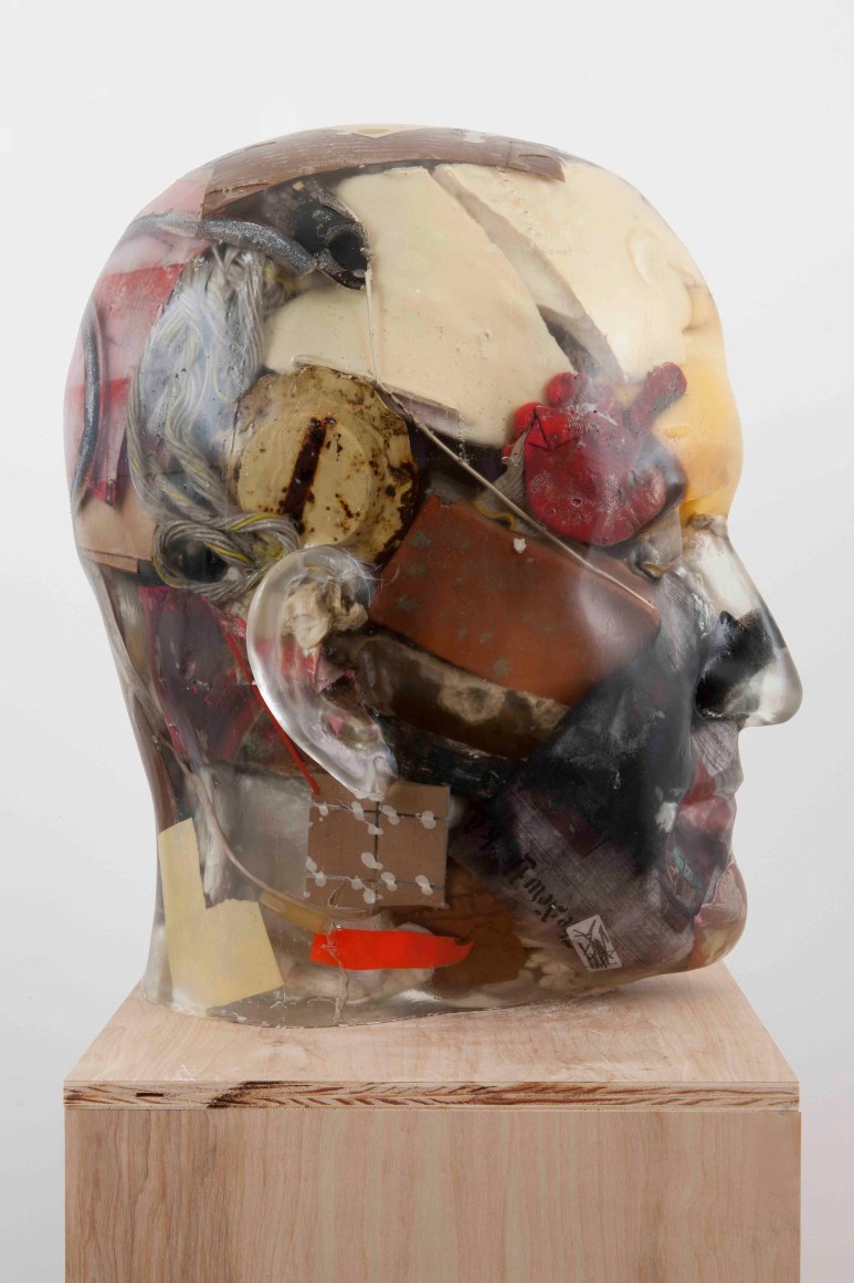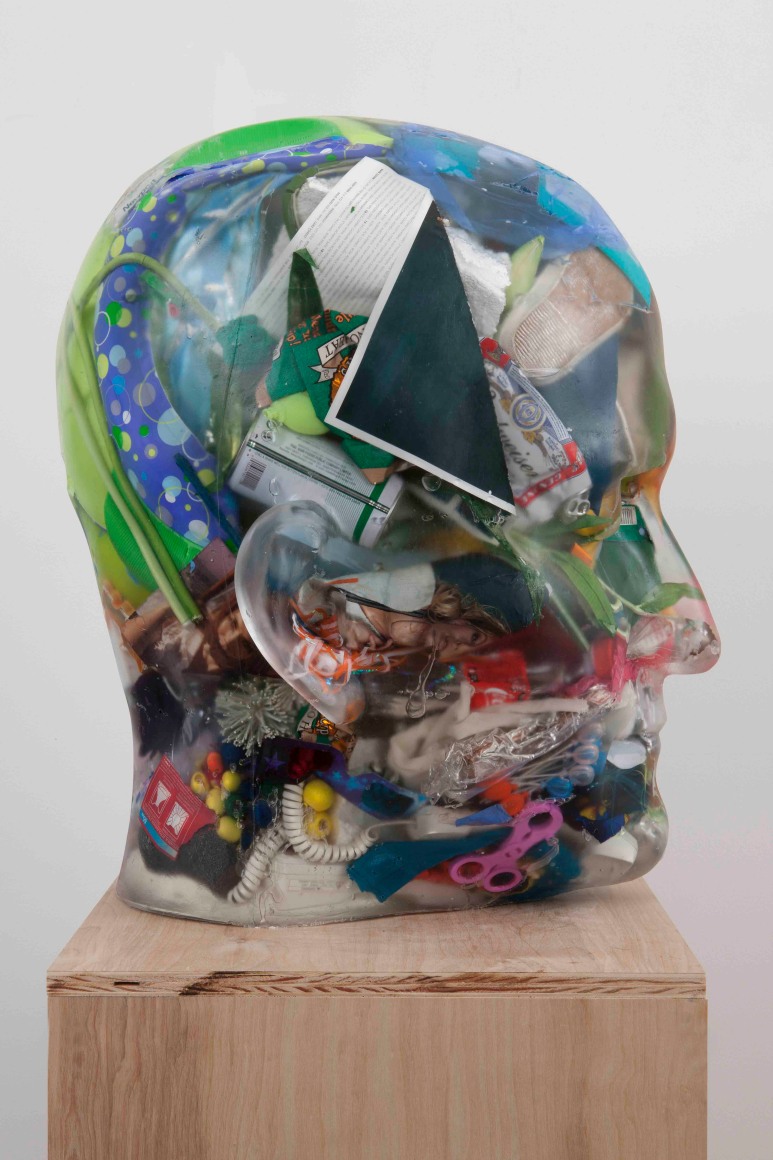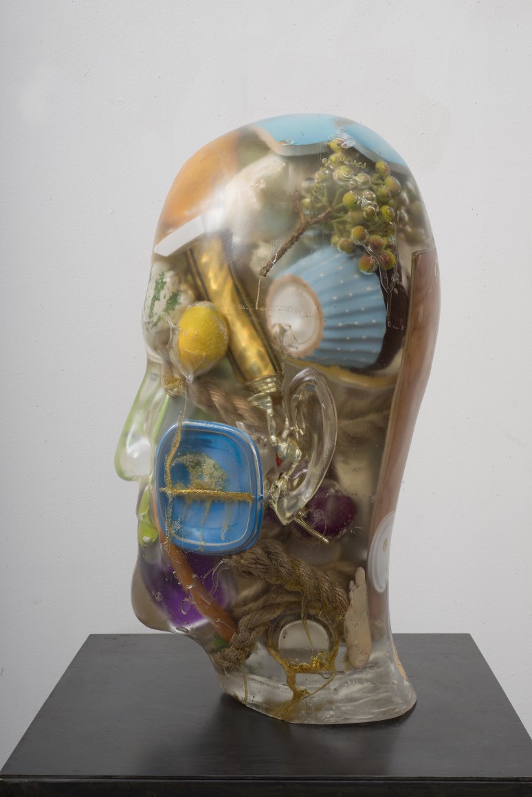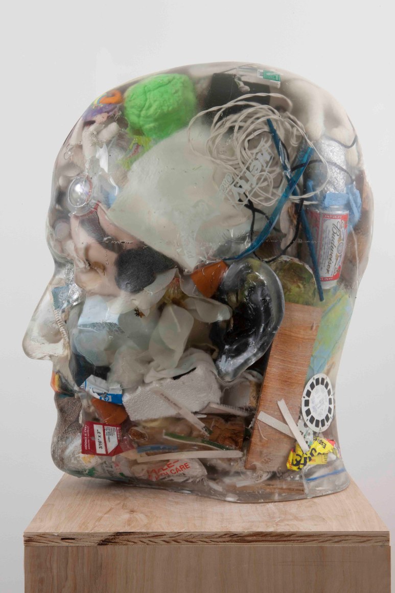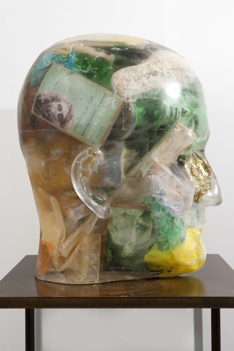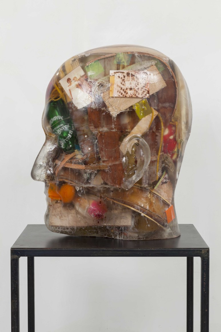 solid cast UV stable polyurethane resin with studio and personal detritus, found and salvaged objects, books.