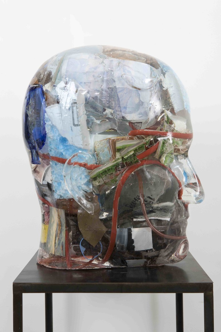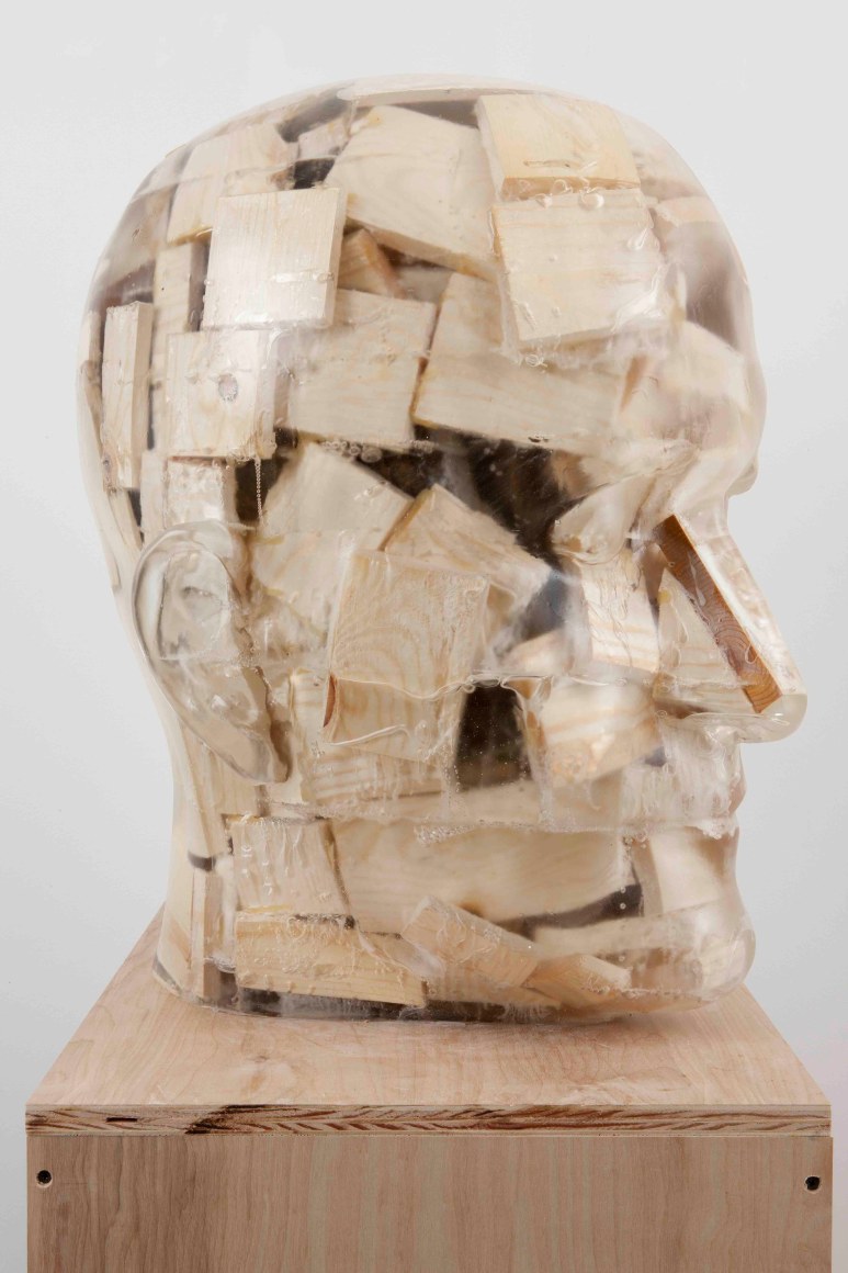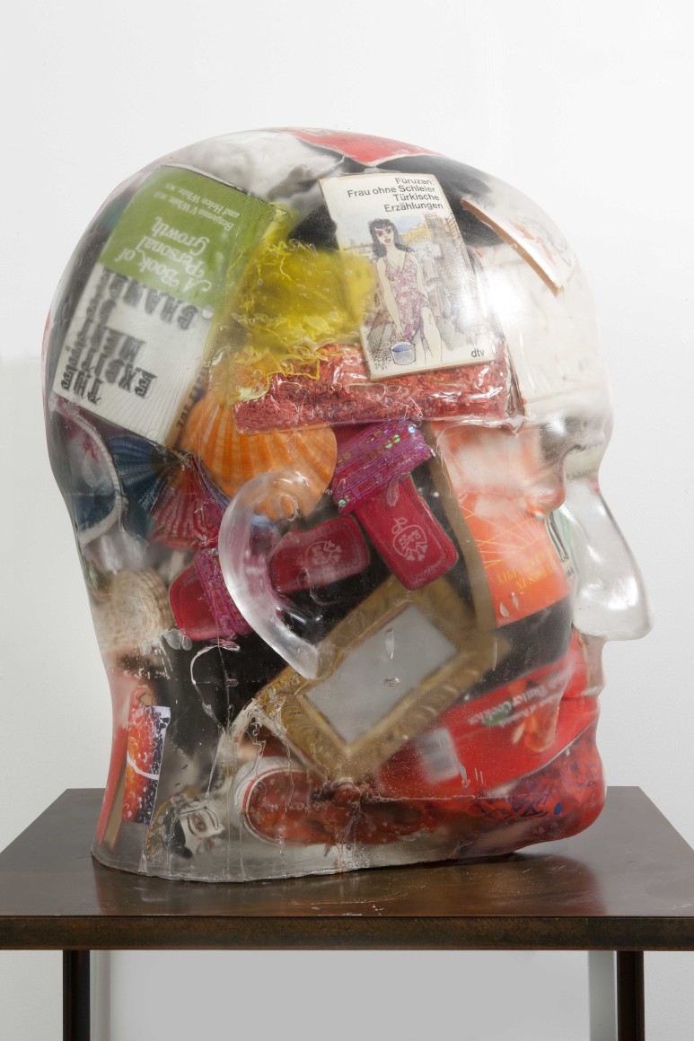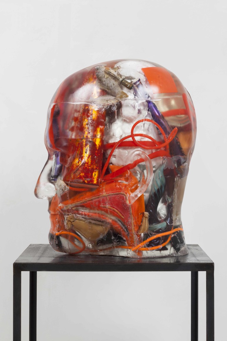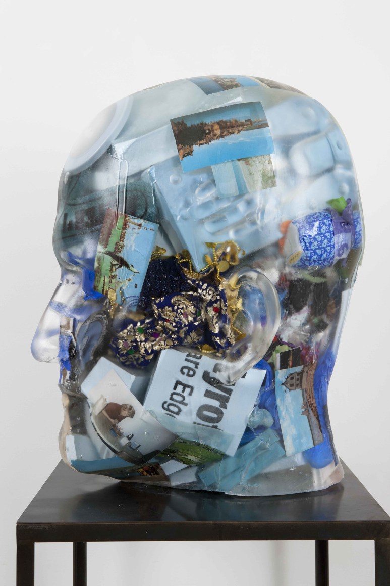 solid cast UV stable polyurethane resin with studio and personal detritus, found and salvaged objects, books.