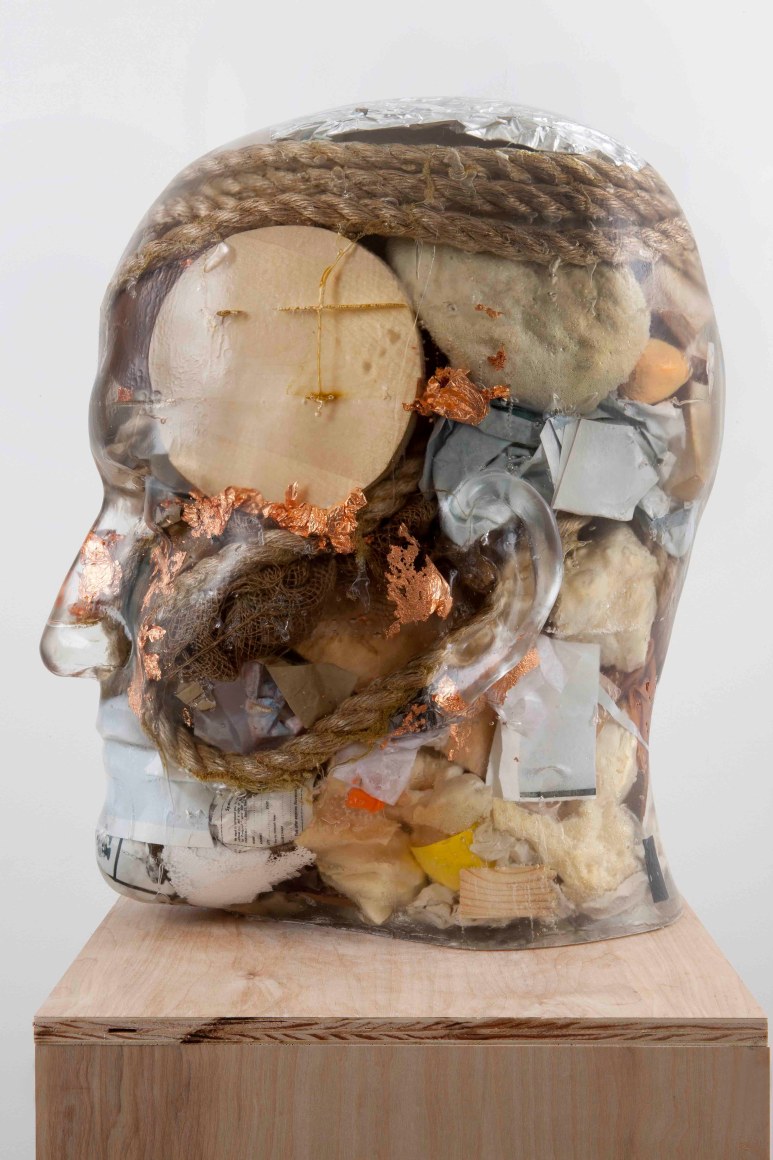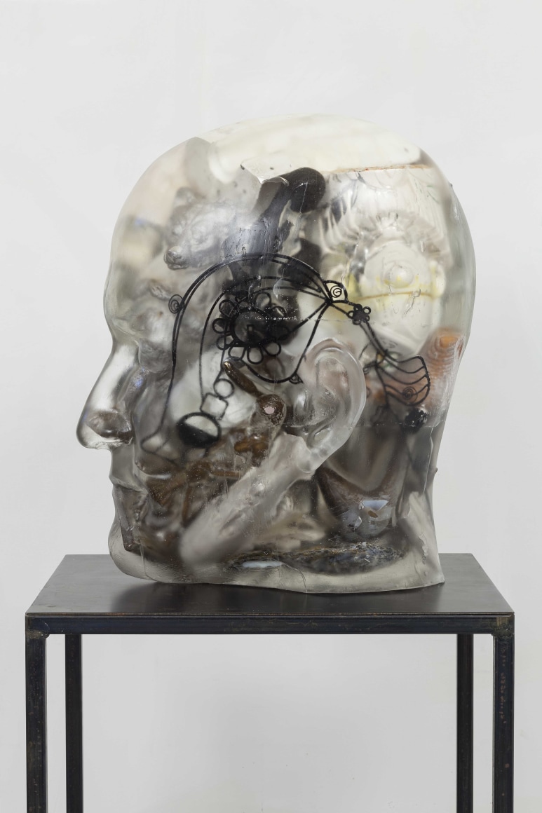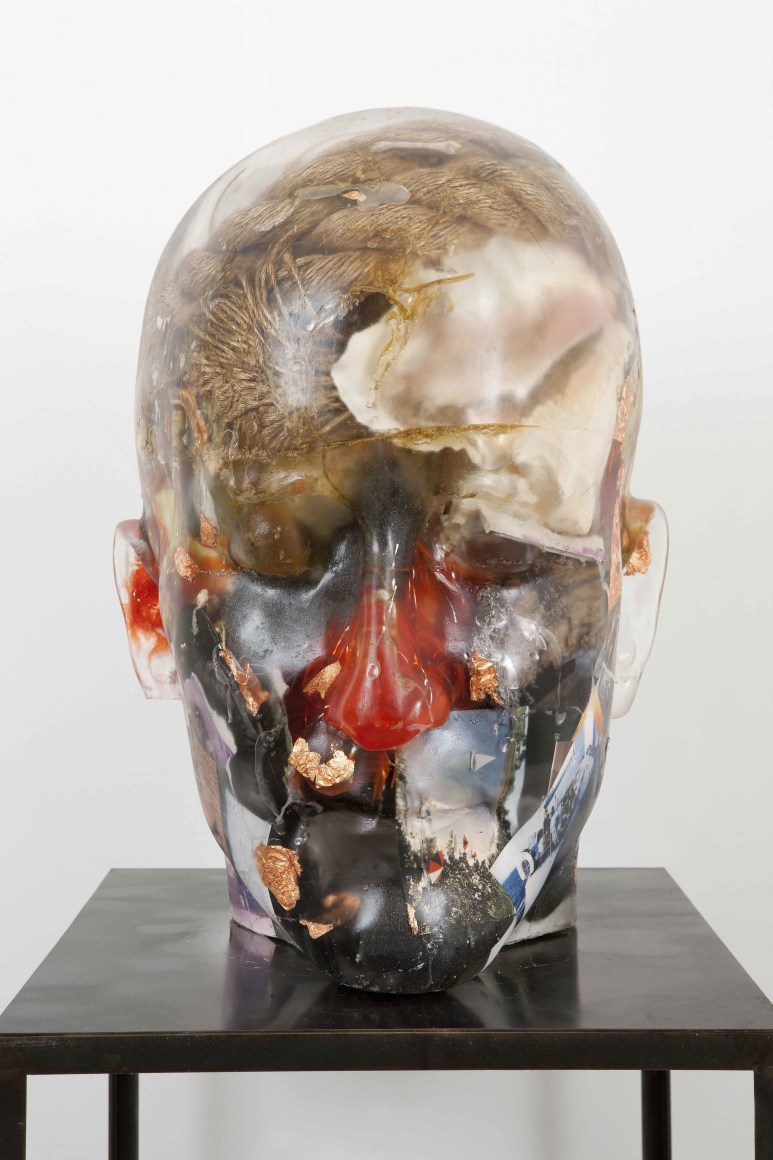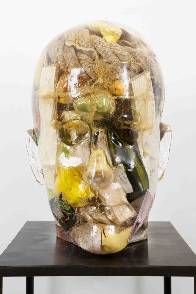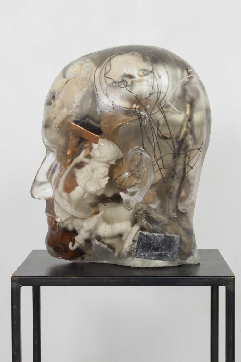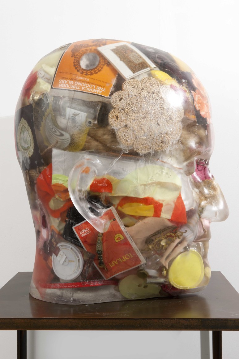 solid cast UV stable polyurethane resin with studio and personal detritus, found and salvaged objects, books.