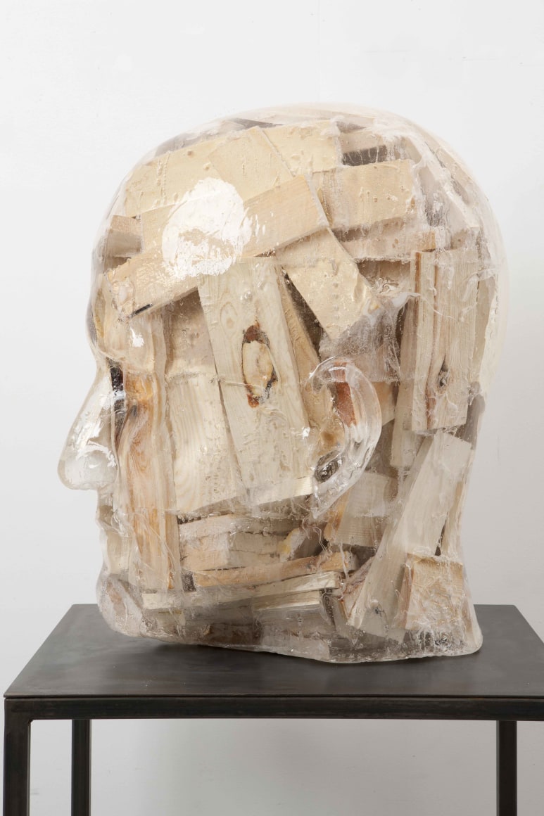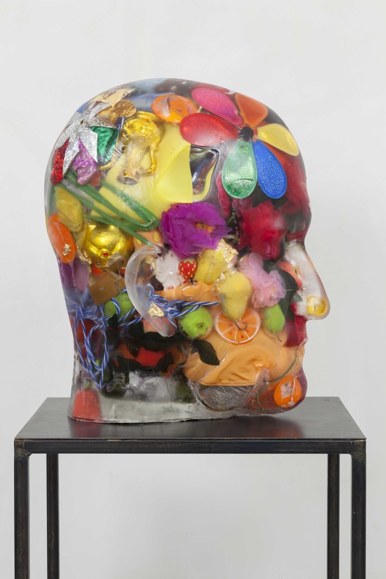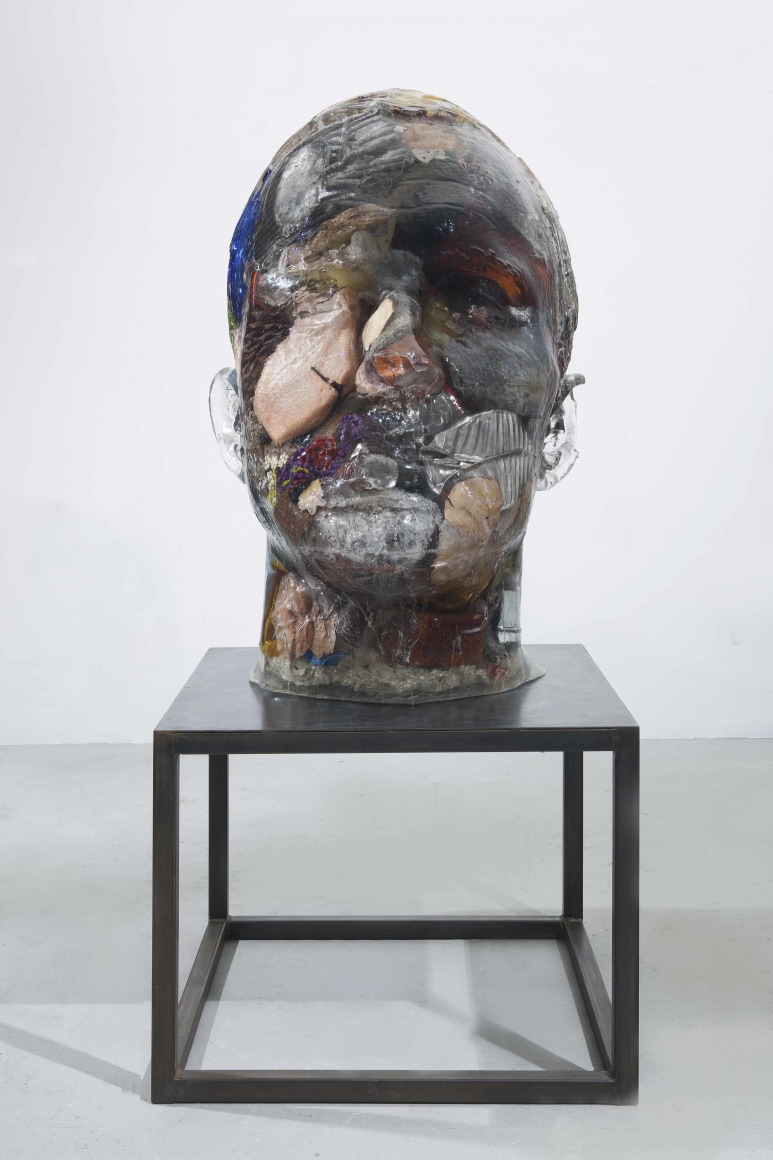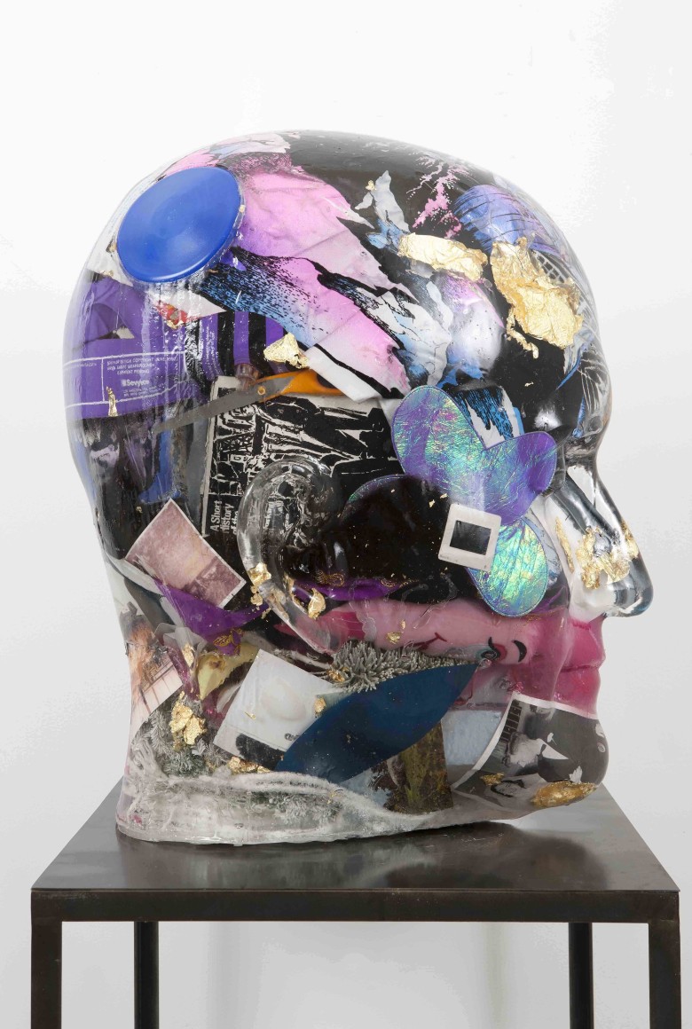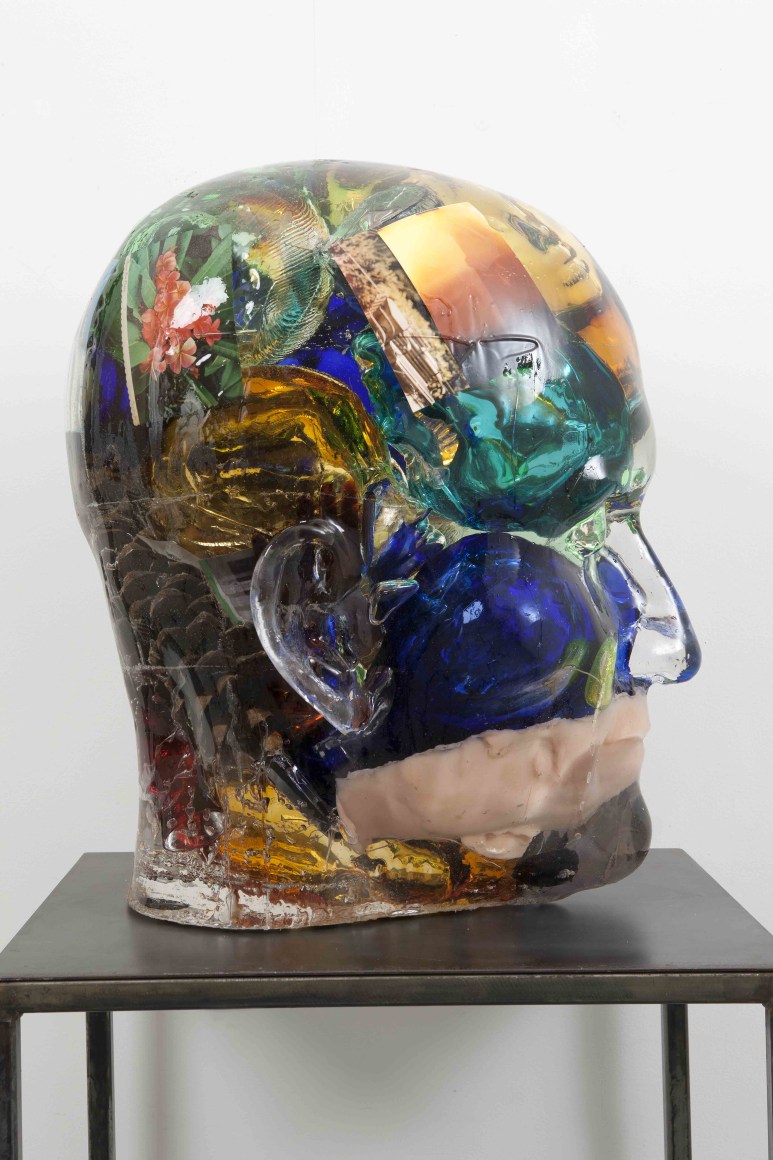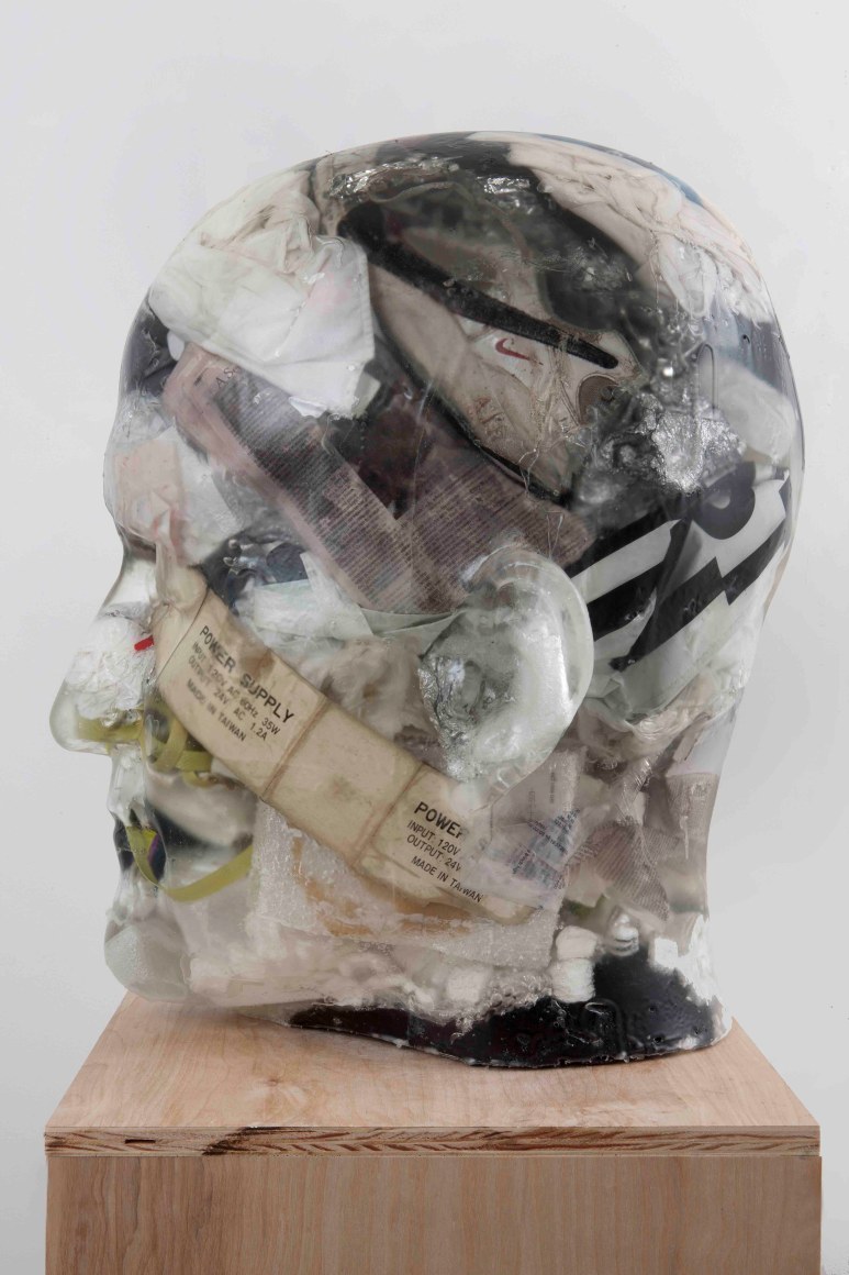 solid cast UV stable polyurethane resin with studio and personal detritus, found and salvaged objects, books.