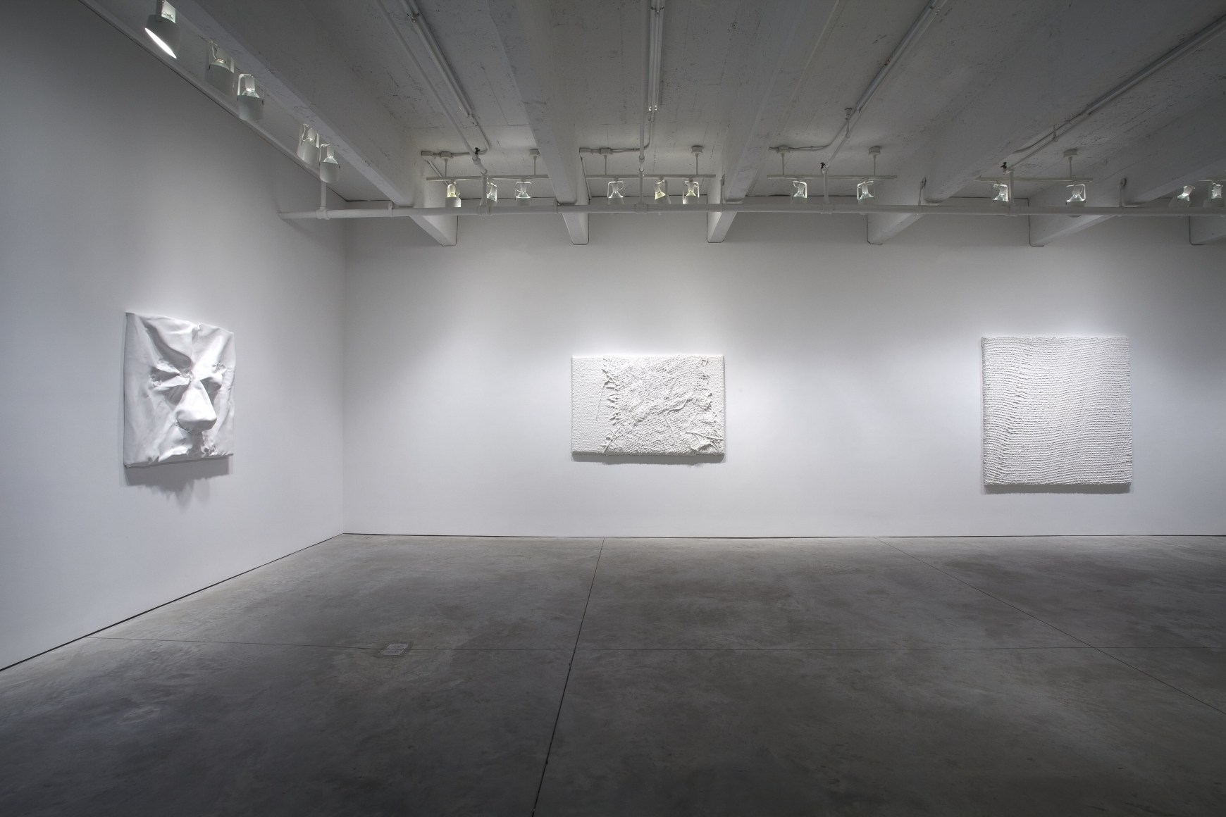 For Sacco (1) and Sacco (2), Dupont used a high-resolution scanner to laser scan a small series of elemental canvases in burlap and gesso, enlarged the originals roughly 500%, and cast the results in white resin and marble dust. The ensuing monochromatic reliefs open up dynamic new spaces of inquiry for Dupont: They engage abstract painting as a dialogue with external methods and meanings, sample aspects of collage and the readymade, and extend elements of performance into the art object. Collapsing hierarchies of media, these works are part digital enlargement, part sculpture, and part painting. As the titles suggest, the works may allude to Alberto Burri’s Sacco paintings, which he began making on discarded sugar sacks while interned in an American prisoner of war camp after the Second World War.